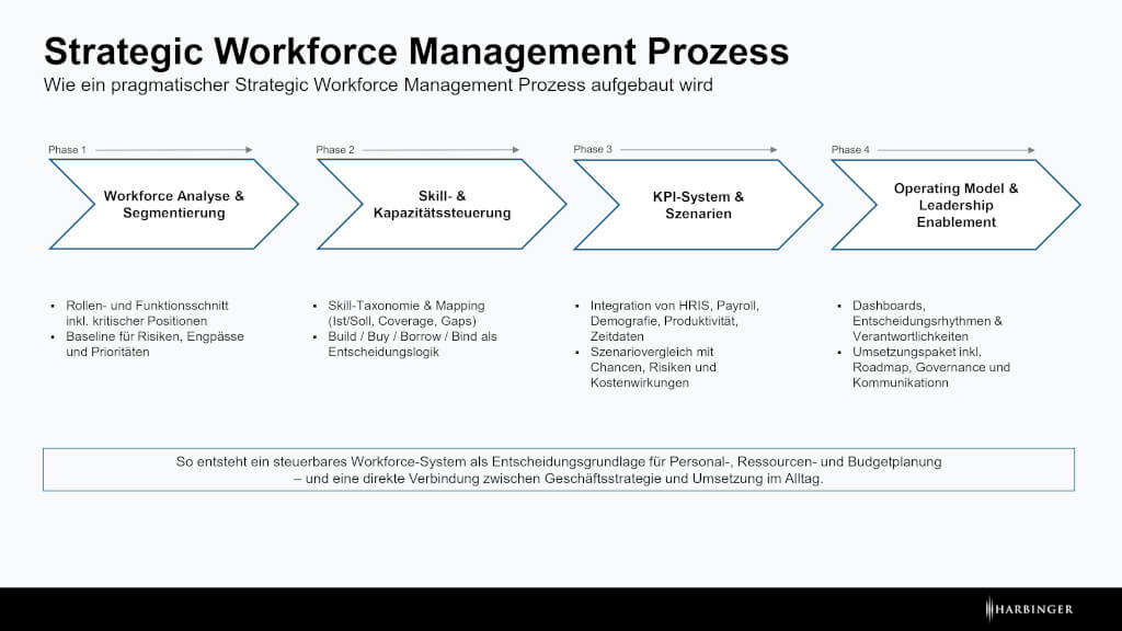 | Operating Model & Leadership Enablement | Dashboards, Entscheidungsrhythmen, Governance und Umsetzungsroadmap | dauerhafte Verankerung von Strategic Workforce Planning im Management |