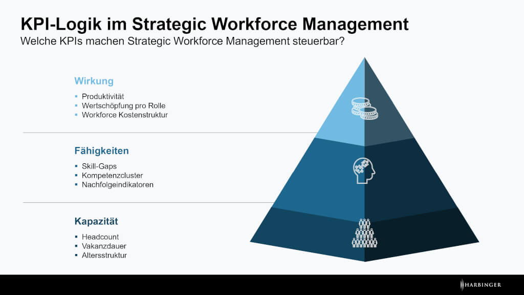 Wichtig ist dabei: Nicht die Menge der Kennzahlen entscheidet über den Nutzen, sondern ihre Struktur. Erfolgreiche Organisationen arbeiten häufig mit einer klaren KPI-Logik, die drei Ebenen verbindet: Kapazität, Fähigkeiten und Wirkung. Diese Ebenen spiegeln wider, wie sich strategische Personalplanung tatsächlich auf die Leistungsfähigkeit des Unternehmens auswirkt.
