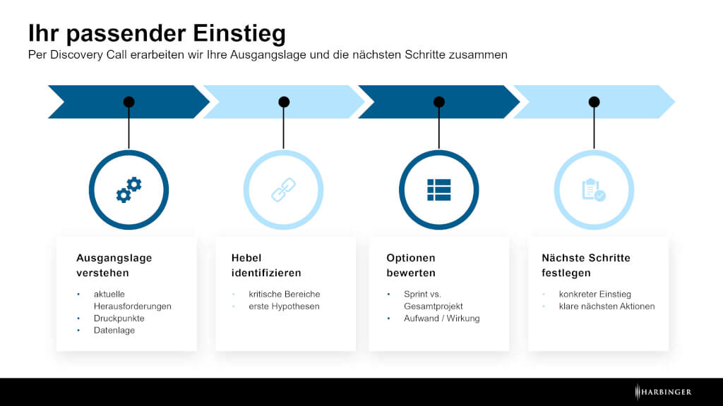 Gleichzeitig gilt: Wenn Sie bereits Klarheit und Commitment haben, kann dieser Ansatz direkt in ein umfassendes Transformationsprojekt überführt werden.